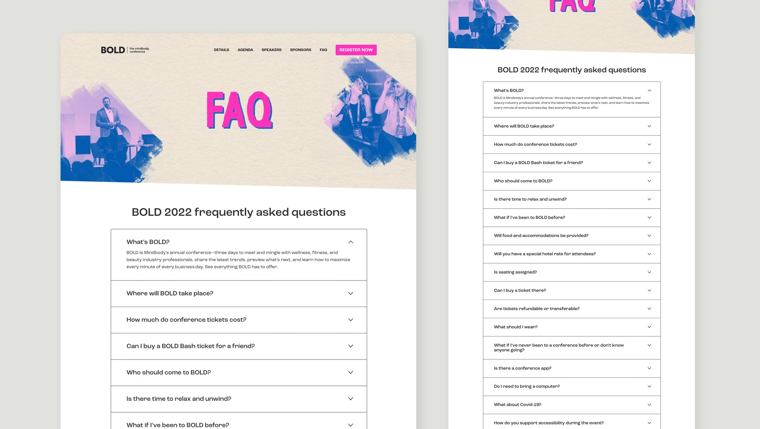 BOLD is an annual 3-day wellness conference incorporating peer networking, celebrated industry speakers, and wellness classes. The ask was to deliver a vibrant, eye-catching theme that would excite and empower wellness business owners. As lead designer on this project, I was responsible for conceptual branding, art direction, style guidelines, web design, app design, and style guidelines. The creative direction I solidified was used for all digital marketing campaigns, print, swag, and on-site event activation.
