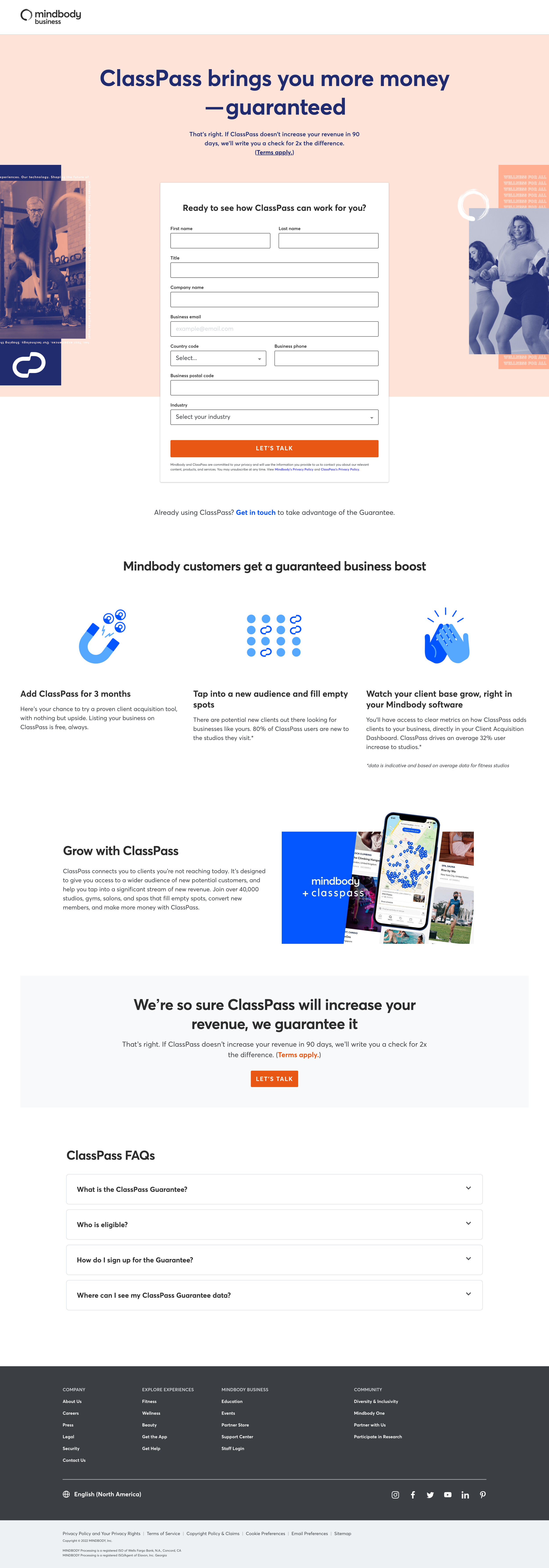 ClassPass Landing PageDeliverables: Art direction for product launch, and design execution for the new ClassPass Guarantee Page. ClassPass Landing Page
